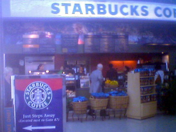 Note this sign at Dulles, directing you to a Starbucks. You approach it from the entrance to Terminal B, and if you follow the sign immediately and turn right, you will not look to your left and find there is another Starbucks immediately behind you. Luckily, I already had my venti coffee from the third Starbucks in the kiosk that was just past security.