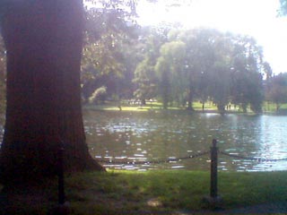 Certainly, the Public Gardens need no gloss. It’s beastly hot here today (i.e., what I’d be getting if I stayed in Washington), but the Gardens have plenty of shade and a steady breeze. The feel here reminds me of Hyde Park in London; it’s a bit more bedecked with benches and human amenities than is the British custom, but it has the same sense of calm. Washington has her fair share of parks, but the closest thing we have to a place like this is the Tidal Basin, which unfortunately is not in my part of town. And the Basin somehow doesn’t have the human scale that I’m seeing here.